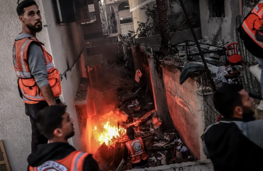 फिलिस्तीनी नागरिक सुरक्षा कर्मी गाजा शहर में इज़राइली हवाई हमलों का निशाना बने एक जलते हुए घर कि तलाशी ले रहे हैं. [Omar Al-Qattaa/AFP]