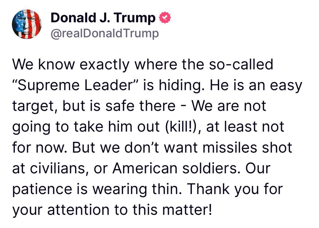 डोनाल्ड ट्रंप ने अपने सोशल मीडिया प्लेटफॉर्म ट्रुथ पर लिखा, “हमें अच्छी तरह पता है कि तथाकथित ‘सुप्रीम लीडर’ कहां छुपे हुए हैं. वह एक आसान निशाना हैं, लेकिन फिलहाल वहां सुरक्षित हैं.”