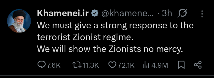 इसके बाद ईरान के सर्वोच्च नेता अयातुल्लाह अली खामेनेई ने लिखा, हमें आतंकवादी जायनिस्ट शासन को कड़ा जवाब देना चाहिए. हम जायनिस्टों पर कोई दया नहीं दिखाएंगे.”