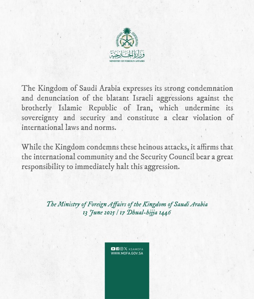सऊदी अरब के विदेश मंत्रालय ने ईरान पर इसराइली हमलों को अंतरराष्ट्रीय कानूनों और मानदंडों का स्पष्ट उल्लंघन बताया है.