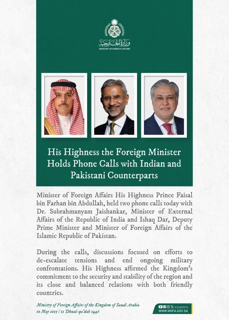 सऊदी अरब के विदेश मंत्रालय ने अपने सोशल मीडिया प्लेटफॉर्म एक्स पर जानकारी दी है कि प्रिंस फ़ैसल बिन फ़रहान ने भारतीय विदेश मंत्री एस जयशंकर और पाकिस्तानी विदेश मंत्री इसहाक डार से भारत और पाकिस्तान के बीच चल रहे सैन्य टकराव को समाप्त करने और तनाव को कम करने के प्रयासों पर चर्चा की.